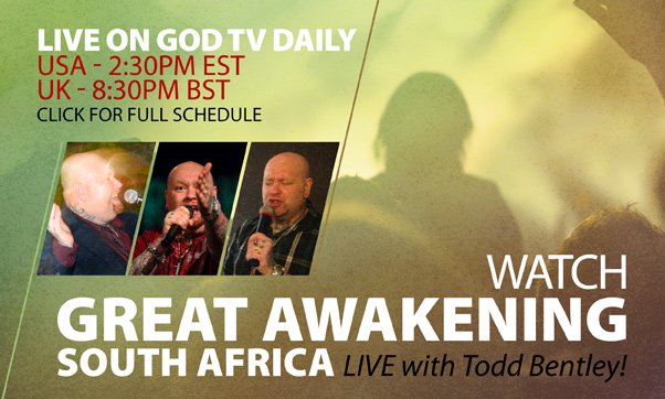 Дурбан, ЮАР, 12 апреля 2013 /Christian Newswire/ —GOD TV вновь прерывает своё расписание, чтобы проводить прямые трансляции пробуждения, на этот раз из Дурбана, ЮАР, где канадский евангелист Тодд Бентли увидел прорыв чудес на своих собраниях. Это Пробуждение Исцеления транслируется с пятницы 12 апреля по воскресенье 14 апреля в 1 ночи (EST) с ежедневными повторами в прайм-тайм.